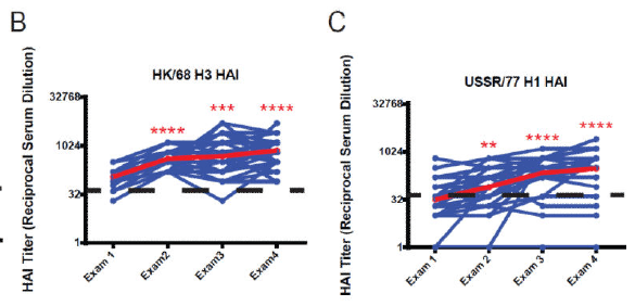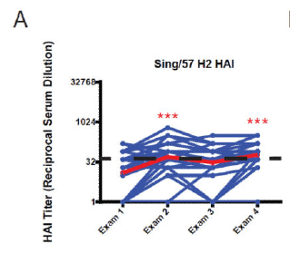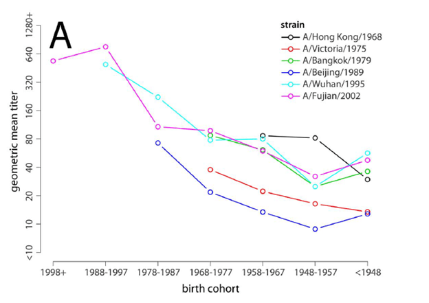 More compelling human data comes from a study evaluating the sera of 40 patients (17) from the Framingham Heart Study who were born between 1917 and 1952. Sera against H2N2, H3N2, H1N1 were evaluated. HAI titers encountered previously (i.e Jap/57 H2) increased over time:
