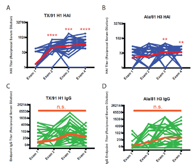 Interestingly, while the HAI increase was statistically significant, that for IgG was not. In another part of the study, the HAI titers against TX/91 and Ala/81 were evaluated. Not surprisingly, HAI titers against both increased over time, though IgG titers, while increasing, did not reach statistical significant: