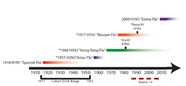 The observations by Thomas Francis that a person’s antibody titers were highest to the strain of influenza they were first exposed to when subsequently exposed to another different strain has been called the “original antigenic sin” (1). Another example of this came from Hoskin’s in 1973, where he evaluated 800 children after vaccinating them with an influenza vaccine containing A/Hong Kong/68 (2). Following an outbreak of A/England/42/72 strain of influenza, sera were obtained from the children. In a subset of children who were vaccinated with A/Hong Kong/68, the development of antibodies against A/England/42/72 was less compared to the vaccine strain. In other words, those who got the vaccine had boosted antibodies when infected by a different strain. Using a relatively recent example, the 2009 influenza pandemic was a strain of influenza A(H1N1). The circulating strain from 1918 to 1957 was influenza A(H1N1), and those patients who were born before 1957 were likely infected with this strain. Due to this, it is believed that during the 2009 pandemic, these patients had partial immunity from severe disease to having being exposed to this original strain. As such, some observations from USA, Mexico, and Australia show that patients lower than expected infection rates in patients aged between 50-60 yo (3,4).