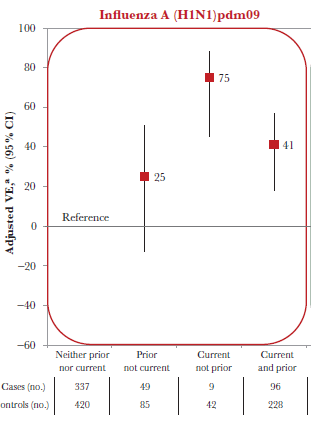 Furthermore, repeat vaccine recipients over 2 seasons had a 2 fold higher risk of H1N1 illness than those who were vaccinated for the current season only (OR 2.33, 95% CI 1.04-5.21). Finally, it was found that patients who were previously exposed to different H1N1 viruses had different vaccine efficacy, which varied by their birth cohort (22):