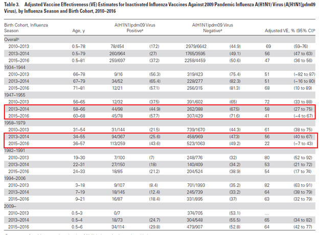 - Flannery B, Smith C, Garten RJ, Levine MZ, Chung JR, Jackson ML, Jackson LA, Monto AS, Martin ET, Belongia EA, McLean HQ, Gaglani M, Murthy K, Zimmerman R, Nowalk MP, Griffin MR, Keipp Talbot H, Treanor JJ, Wentworth DE, Fry AM. Influence of Birth Cohort on Effectiveness of 2015-2016 Influenza Vaccine Against Medically Attended Illness Due to 2009 Pandemic Influenza A(H1N1) Virus in the United States. J Infect Dis. 2018 Jun 20;218(2):189-196. doi: 10.1093/infdis/jix634. PMID: 29361005; PMCID: PMC6009604.