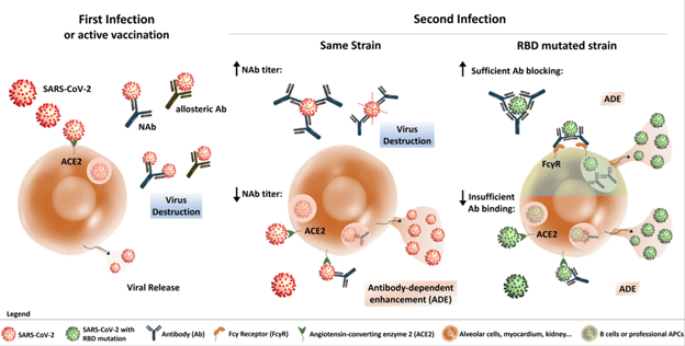 At this juncture, it seems that cross-reactivity between SARS-CoV2 and other human coronavirus antibodies may not play a role yet. In other words, prior infections with SARS-CoV may not convey any protective or deleterious effect for SARS-CoV2. Despite this, there is a concern about potential ADE with repeat infection or infection with a mutated strain. In terms of the former, as it was mentioned previously with Dengue, low neutralizing antibody titers following acute infection may lead to internalization of Ab-Ag complex and increase viral replication/increase cytokine release. In terms of the latter, RBD mutated strains may not allow for neutralization of the pathogen despite prior antibody and thus, antibody dependent enhancement may ensue (29).