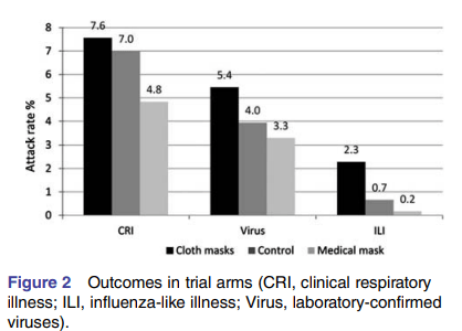 An earlier RCT in healthcare workers in high risk wards (186) evaluated surgical masks with cloth masks (two-layer made of cotton) during a 4 week period. Cloth masks actually resulted in a higher attack rate in all primary outcomes of the trial: